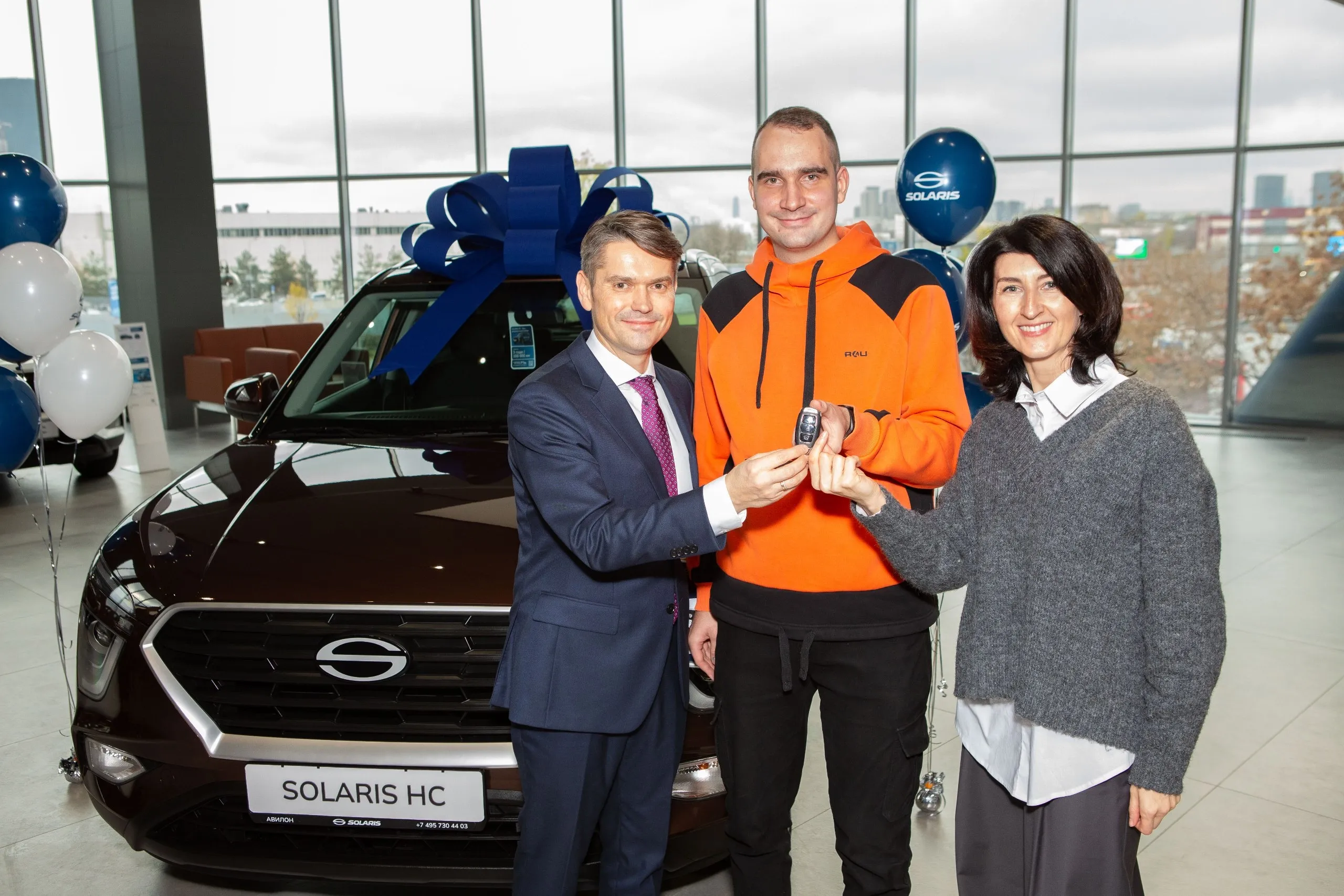 Церемония награждения прошла 01.11.2025 в торжественной обстановке: победитель получил ключи от нового Solaris HC, сделал совместное фото с представителями брендов и познакомился со своим новым кроссовером. Solaris HC — это сочетание высокого качества, комфорта и надёжности, полностью отвечающее требованиям современных российских автолюбителей.